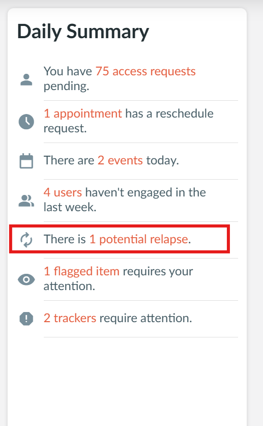 The Potential Relapse list is designed to show any app users who have changed or updated their recovery milestone since they last established a milestone date. Keep in mind that they may be correcting a date that had been incorrectly entered initially, So it doesn't always mean someone has relapsed.