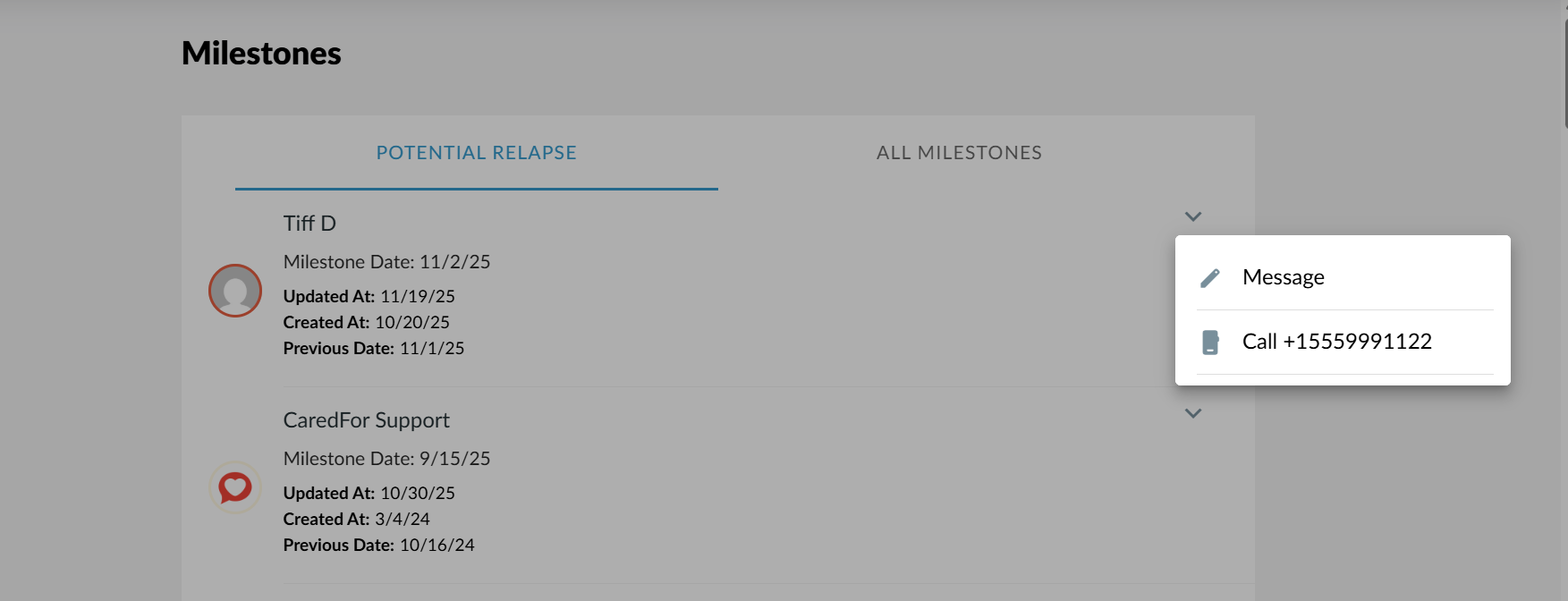 Displayed under each member’s name are the dates for their most recent milestone update, the original milestone creation, and the previously recorded milestone date. To message or call the member, use the dropdown arrow located to the right of their information.
